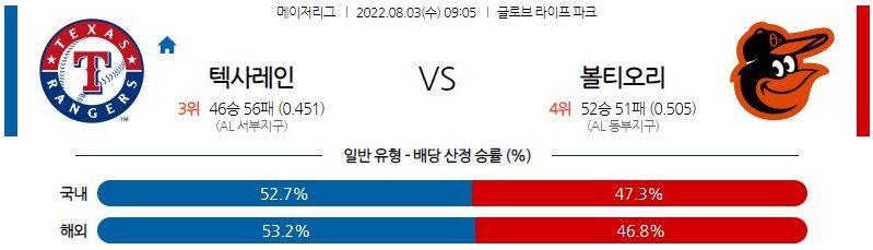【MLB】 8월 3일 텍사스 레인저스 vs 볼티모어
