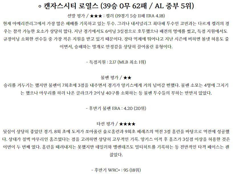 .에인절스(43승 58패 / 리드 데트머스 3승 3패, 3.84) 데트머스는 7월 마이너에서 복귀후 치른 3경기에서 1승(2QS) 1.06의 성적을 기록하고 있다. 변화구 제구가 상당하고 피안타율은 0.172밖에 되지 않는다. 지난 노히터 경기 이후 하락세를 완벽하게 끊어낸만큼 오늘도 준수한 피칭을 펼쳐줄것으로 기대된다. 그리고 오늘 불펜에서는 어제…