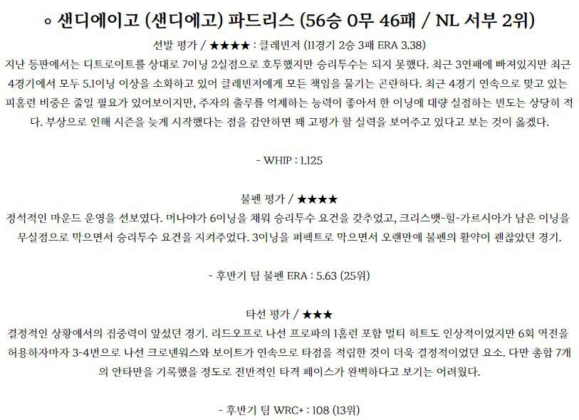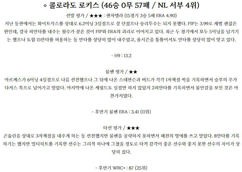 신시내티(39승 61패 / 닉 로돌로 3승 3패, 4.73) 로돌로는 직전 마이애미와의 경기에서 6이닝 2실점(비자책)을 기록했다. 이날 시즌 첫 QS피칭달성에 성공했는데 투심과 슬라이더의 효과가 상당히 좋았다. 다만 이날 상대가 좌완에 약한 마이애미 였다는 점은 꼭 감안해야 했던 경기였다. 올시즌 전반적으로 슬라이더의 강점이 크지 않은선수라는 점도…