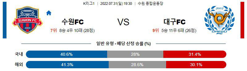 7월31일 수원 FC 대구 FC K리그1 한국 축구 경기분석을 시작하겠습니다. 이번경기는 오후 7시 30분에 시작이 되는 경기인데, 수원 FC가 대구 FC를 홈에서 맞이하게되는 경기입니다. 수원 FC는 8승4무10패를 기록하고 있는 팀이고 대구 FC는 5승11무6패를 기록하고 있는 팀인데, 수원 FC 대구 FC 두 팀의 최근 전력은 수원이 우세할 가능성이 있습니다.