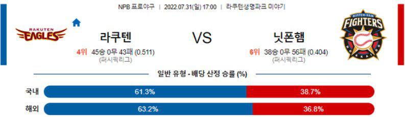 전일 경기에서 라쿠텐은 1회 부터 마지막 공격 이닝까지 쉬지 않고 찬스를 만들어 내며 7-0, 완승을 기록했다. 전일 경기 승리의 과정에서 경기내용이 좋았다는 것이 후지히라 쇼오마 투수의 어깨를 가볍게 해주는 득점 지원의 가능성을 우선적으로 생각하게 만든다. 라쿠텐 승리 가능성을 추천 한다.