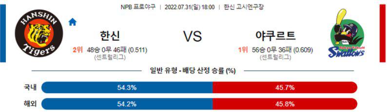 2군에서 복귀한 이후 2경기에서 14이닝 1실점(비자책)을 기록중인 조 건켈 투수에 대한 기대치가 높은 선발 매치업 이다. 또한, 한신은 전일 경기에서 4회 빅이닝(5득점)을 만들어 내는 가운데 7-3, 승리로 5연승의 상승세를 유지하게 된 타이밍. 한신 승리 가능성을 추천 한다.