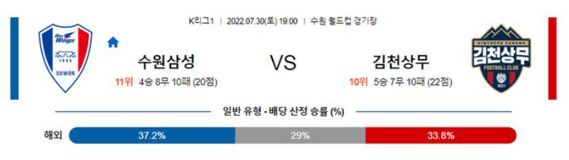 후술하겠으나, 양 팀 주소모두 최근 흐름이 좋지는 않다. 다만, 수원삼성은 홈에서 아직 승리 비율이 더 높으며, 최근 이적생들이 출전 시간을 늘려 가며 좋은 활약을 펼치고 있다. 반면 김천은 원정에서의 수비 균열이 자주 일어나고 있으며 이에 따라 원정 약세가 이어지는 중. 여기에 군 팀 특성 상 여름 이적시장에서의 보강도 없었다. 이번 일정은 수원삼성이 승리를 거둘 것으로 예상된다. 다만, 김천도 조규성(FW)을 필두로 1골 정도는 넣을 능력치를 보유하고 있다. 오버(2.5 기준) 선택도 겸하는 쪽이 좋겠다.