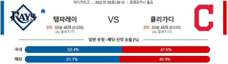 클리블랜드의 승리가 높은 경기라고 본다. 이닝 소화능력에서 비버가 더욱 좋은 모습을 드러낼 가능성이 높으며, 지난 경기에서의 부진은 투수 친화적인 탬파베이 홈에서 상쇄될 가능성이 높다. 다만 클리블랜드의 지난 경기 타격 성과가 좋지 못했고, 스프링스도 복귀전에서 꽤 괜찮은 성과를 냈음을 고려하면 언더를 주력으로 삼는 것도 괜찮은 선택이 될 것이다.