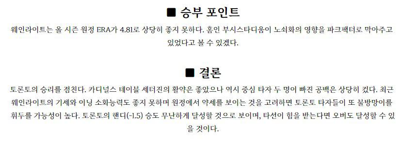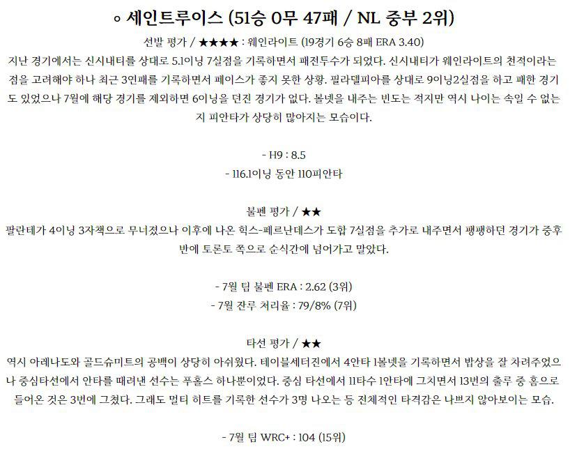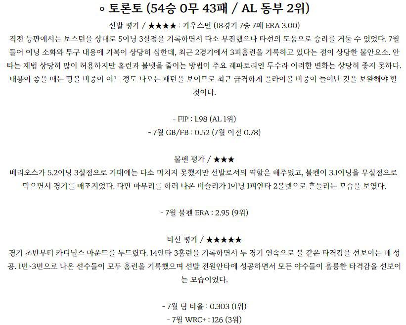◈두산(스탁 7승6패 3.01) 스탁 투수는 이전경기(7/22) 홈에서 SSG 상대로 7이닝 무실점 노디시전을 기록했으며 이전경기(7/13) 원정에서 NC 상대로 5.2이닝 4실점 패배를 기록했다. 2연패 흐름 속에 올시즌 KBO 무대 데뷔후 19경기 7승6패, 11경기 QS 성적이며 5월 5경기, 2승2패, 2.61, 6월 5경기 2승2패, 4.76,…