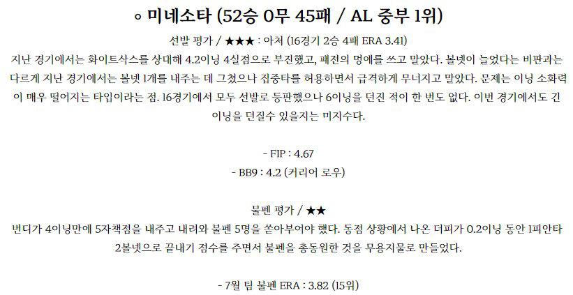 ◈기아(파노니 1승1패 5.59) 토마스 파노니 투수는 이전경기(7/22) 원정에서 롯데 상대로 5.1이닝 2실점 승리를 기록했으며 KBO 무대 데뷔전 이였던 이전경기(7/14) 원정에서 LG 상대로 4.1이닝 4실점 패배를 기록했다. 파노니 투수는 최고 구속은 148km 이지만 포힘 패스트볼, 컷 패스트볼, 슬라이더, 커브, 체인지업등 다양한 구종을 장…