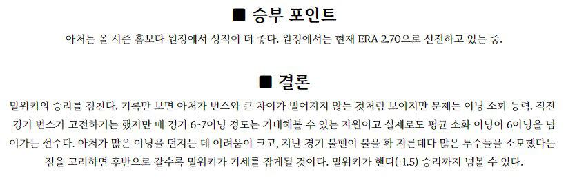 ◈두산(스탁 7승6패 3.01) 스탁 투수는 이전경기(7/22) 홈에서 SSG 상대로 7이닝 무실점 노디시전을 기록했으며 이전경기(7/13) 원정에서 NC 상대로 5.2이닝 4실점 패배를 기록했다. 2연패 흐름 속에 올시즌 KBO 무대 데뷔후 19경기 7승6패, 11경기 QS 성적이며 5월 5경기, 2승2패, 2.61, 6월 5경기 2승2패, 4.76,…