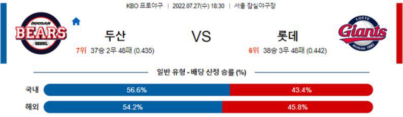 이영하 투수는 직전경기(7/24) 홈에서 SSG 상대로 구원으로 나와서 0.2이닝 1실점 패배를 기록했으며 이전경기(7/10) 홈에서 LG 상대로 3이닝 4실점 패배를 기록했다. 2연패 흐름 속에 올시즌 18경기 6승6패, 7경기 QS 성적이며 5월 5경기 2승1패, 2.52, 6월 5경기 3승1패, 3.64, 7월 3경기 2패, 6.00 의 기록. 올시즌 18차례 등판중 11경기에서는 149km 직구 이외에도 커브, 슬라이더, 포크볼의 구위가 위력이 있었고 나머지 7경기에서는 제구 불안의 문제점이 나타났다. 올시즌 홈에서 10경기 2승4패, 5.96 올시즌 상대전 3경기 승패없이 2.89, 18.2이닝 7실점(6자책) 기록이 있다.
