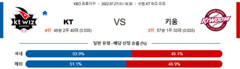 올시즌 홈에서는 6경기 3승2패, 3.19의 기록 속에 안정감을 보였던 정찬헌 투수 였지만 원정에서는 피안타 허용률이 올라갔고 올시즌 상대전 무실점 승리투 역시 홈에서 나온 경기였다. 또한, 동일하게 12안타씩 주고 받은 전일 경기에서 7-8 패배를 당한 KT 이지만 9회 추격의 득점을 만들어 냈고 홈런의 숫자는 KT가 키움 보다 2개(3-1)가 더 많았다. 올시즌 선발과 불펜을 오가며 자신의 몫을 꾸준하게 해내고 있는 엄상백 투수가 선발 싸움에서 우위에 있고 KT타선의 폭발도 가능한 타이밍에 걸린 경기라고 생각 된다. KT 승리 가능성을 추천 한다.