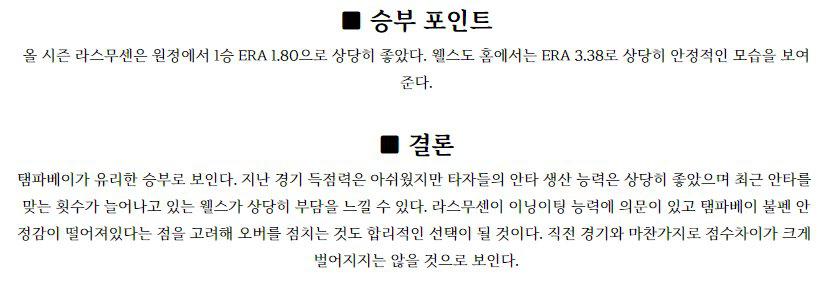 두산(이영하 6승6패 4.32) 이영하 투수는 직전경기(7/24) 홈에서 SSG 상대로 구원으로 나와서 0.2이닝 1실점 패배를 기록했으며 이전경기(7/10) 홈에서 LG 상대로 3이닝 4실점 패배를 기록했다. 2연패 흐름 속에 올시즌 18경기 6승6패, 7경기 QS 성적이며 5월 5경기 2승1패, 2.52, 6월 5경기 3승1패, 3.64, 7월 3경…