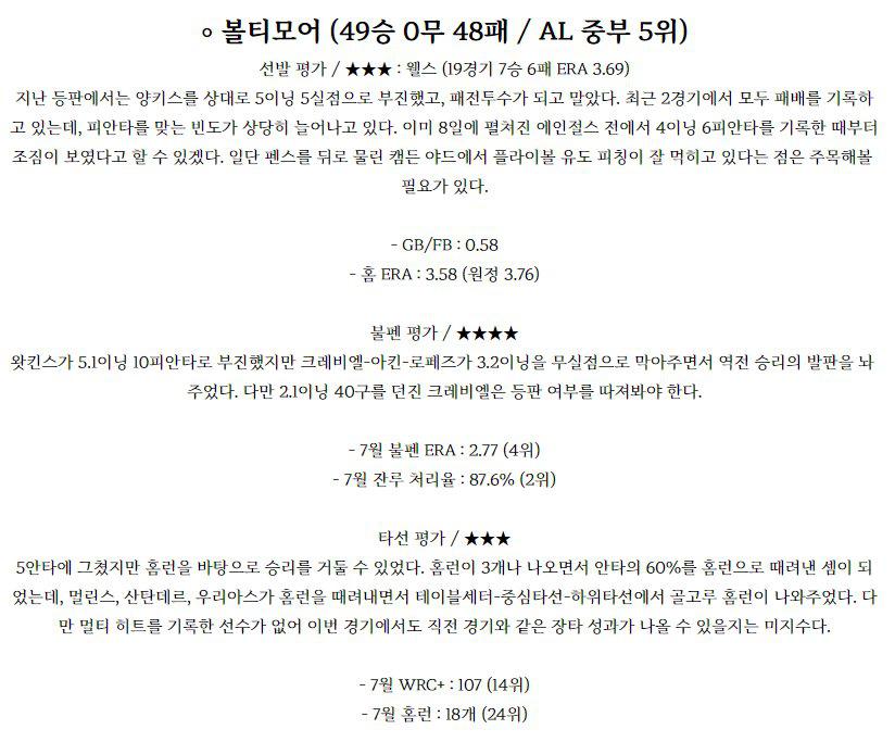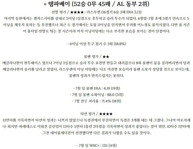 시애틀 매리너스 (52승 0무 45패 / AL 서부 2위) 선발 평가 / ★★★ : 커비 (12경기 2승 3패 ERA 3.78) 지난 등판에서는 토론토를 상대로 고전하면서 4.1이닝 2실점을 기록했다. 토론토 강타선을 맞아 10개의 피안타를 내주었고 결국 5이닝을 채우지 못하고 내려가야 했다. 올해 BB/9이 1.3일정도로 상당히 공격적으로 승부를 하는…