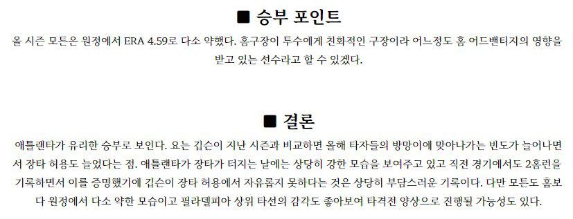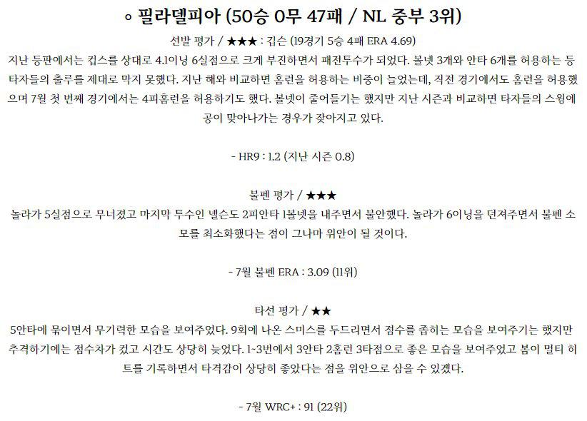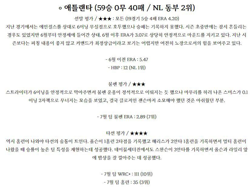 KT(엄상백 6승2패 3.53) 엄상백 투수는 직전경기(7/10) 홈에서 롯데 상대로 구원으로 나와서 2.1이닝 2실점 노디시전을 기록했다. 3연승 흐름 속에 올시즌 21경기(선발 11경기), 3경기 QS 성적이며 5월 5경기 2승1패, 4.78, 6월 7경기(선발 3경기), 3승, 2.38, 7월 3경기 승패없이 3.00의 기록. 선발로 등판한 11경…
