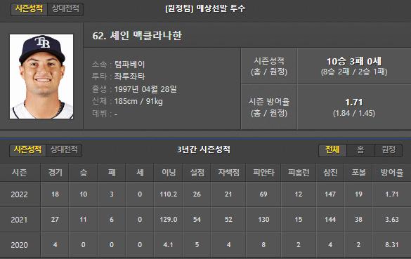 템파베이는 이번 경기 셰인 맥클라나한 선수가 선발로 등판합니다.