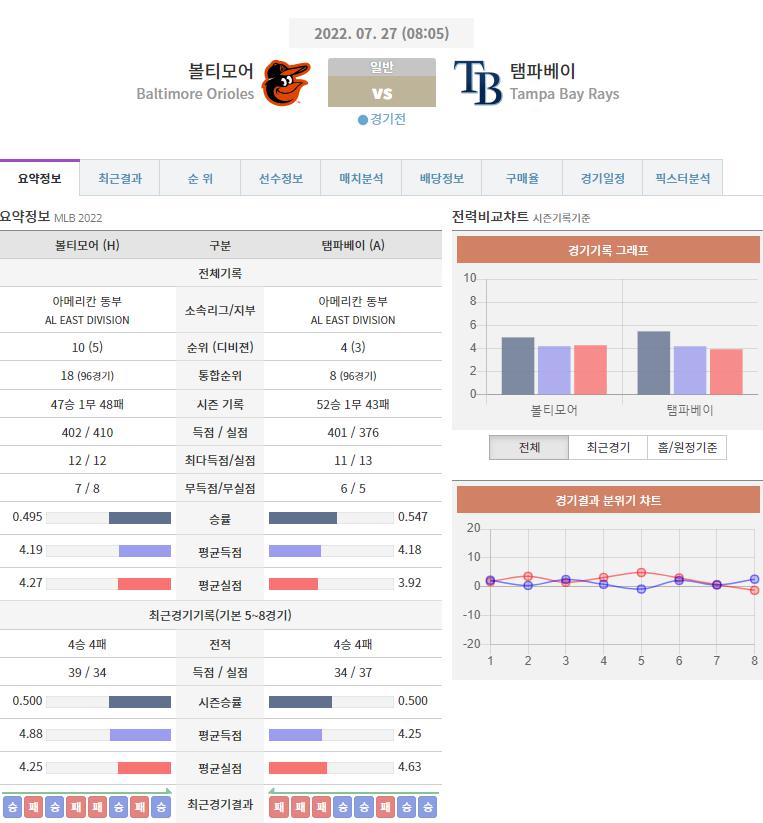 오늘 NPB 분석은 볼티모어 VS 템파베이 분석 준비했습니다.