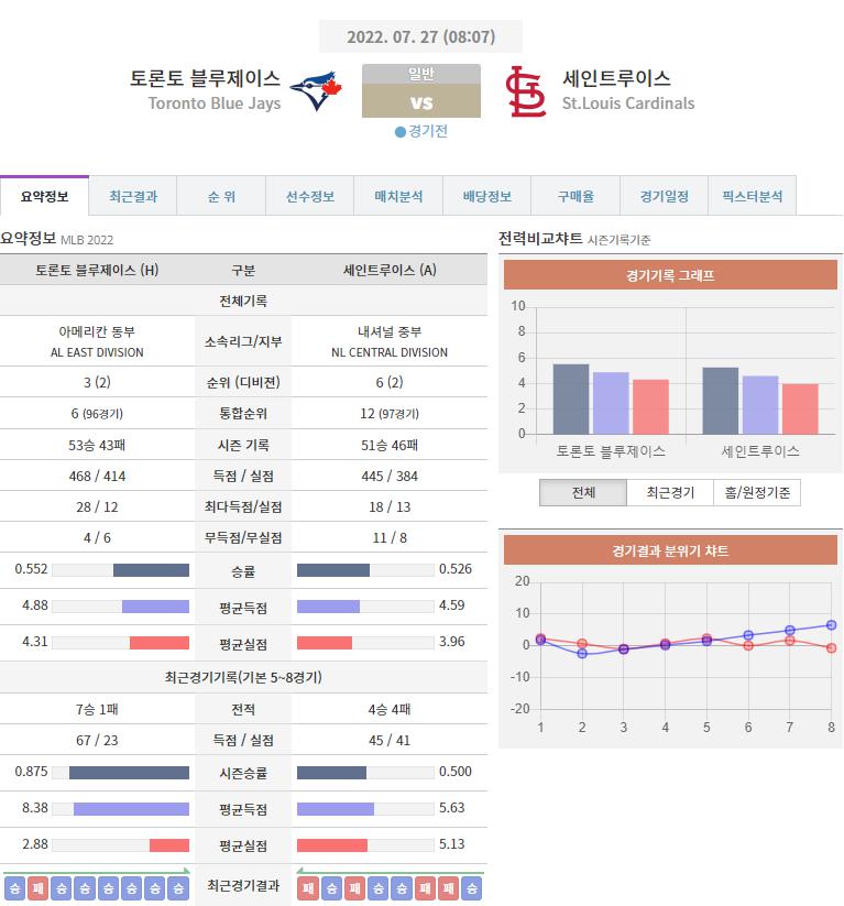 오늘 NPB 분석은 토론토 VS 세인트루이스 분석 준비했습니다.