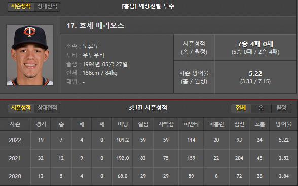 베리오스는 이번 시즌 19경기 7승 4패 101.2이닝 114피안타 59실점으로