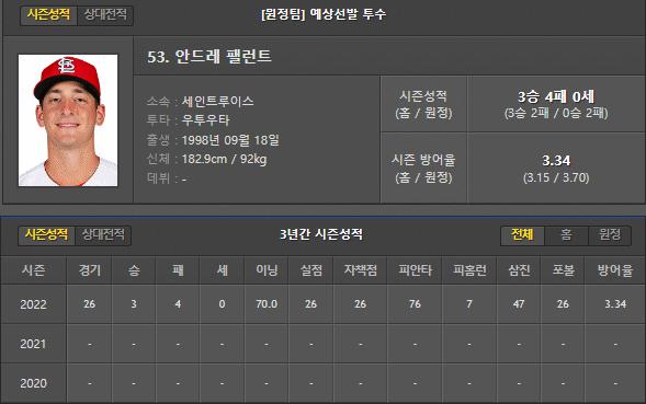 세인트루이스는 이번 경기 안드레 팰런트 선수가 선발로 등판합니다.