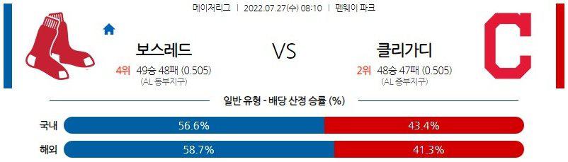 오버를 점치는 것도 좋아보이는 매치. 물론 직전 경기에서는 양 팀의 타격감이 좋아보이지는 않았지만 이번 경기에서는 홈에서 약한 윈코우스키가 나오며 클리블랜드는 불펜데이로 나서지만 한 달간 불펜 성과는 썩 좋지 못했다. 양 팀 중심타선의 컨디션도 그럭저럭 나빠 보이지는 않았다. 그나마 상대적으로 직전 경기에서 중심 타선의 활약이 좋았던 보스턴의 승리를 점치는 것이 나아보이는 매치.