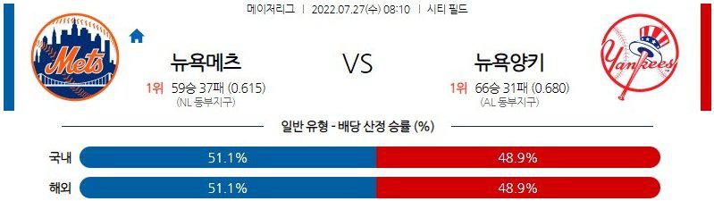 선발투수들이 쉽게 무너질 경기는 아니라 타자들보다는 마운드 싸움으로 경기가 이어질 가능성이 높아보인다. 다만 직전 경기에서 객관적인 불펜의 활약은 메츠보다는 양키스가 더욱 나아보였으며, 타선 싸움에서도 스탠튼이 합류할 가능성이 있고 저지가 좋은 폼을 보여주고 있는 양키스가 앞서면 앞섰지 뒤질 이유는 없다. 양키스의 승리와 7.5기준 언더를 픽하는 것이 좋아보이는 매치다.