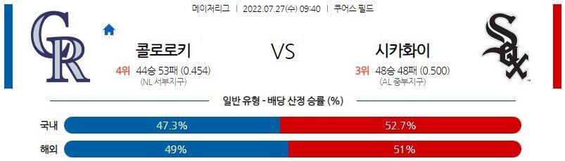 오버를 주력으로 삼는 것이 좋겠다. 콜로라도 선수들의 직전 타격감은 좋아보이지 않았으나 해당 경기가 쿠어스 필드이고, 브라이언트가 라인업에서 빠져 있었다는 점을 감안해야 한다. 화이트삭스 타자들의 컨디션과 장타력도 나쁘지 않았고, 마르케즈도 쿠어스에서는 올 시즌 상당히 고전했다. 코팩이 쿠어스에서 던져본 적이 없다는 점은 변수지만 불펜 상황이 좋지 못해 후반에 난타전으로 갈 가능성이 높다. 핸디(+1.5)를 걸고 직전 경기 마운드가 안정적이었던 콜로라도의 선전을 점치는 것도 좋겠다.