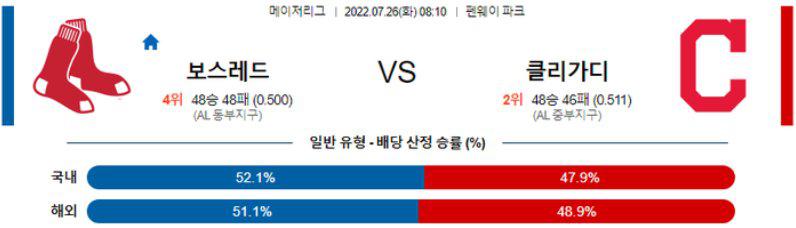 오버를 주력으로 삼는 것이 좋아보이는 매치. 피베타의 구위와 구속이 살아나지 않는다면 또 피안타에 시달릴 가능성이 높고 플레삭도 정타를 허용하는 빈도가 매우 잦은 편이다. 해당 경기가 타자 친화적인 팬웨이파크에서 벌어지는 것도 타자들에게는 호재인데, 올 시즌 팬웨이파크는 파크팩터에서 4위를 기록하고 있다. 클리블랜드의 최근 뒷심과 불안한 보스턴 불펜 상황을 감안하면 클리블랜드가 후반에 경기를 뒤집을 가능성도 엿보이고 있다.