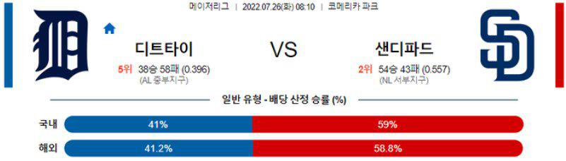 샌디에이고의 승리가 예상된다. 머나야가 원정에서 더욱 훌륭한 피칭 내용을 보여주고 있으며, 디트로이트의 월간 타격 성적과 직전 경기에서의 타격감 주소모두 좋아보이지 않았다. 디트로이트 선발 허치슨의 안정감과 이닝 소화능력을 장담하기 어렵고 지난 경기에서 샌디에이고 타선의 타격감은 나쁘지 않아 보였다. 샌디에이고의 핸디(+1.5) 승리까지 점쳐볼 수 있을 것이다.