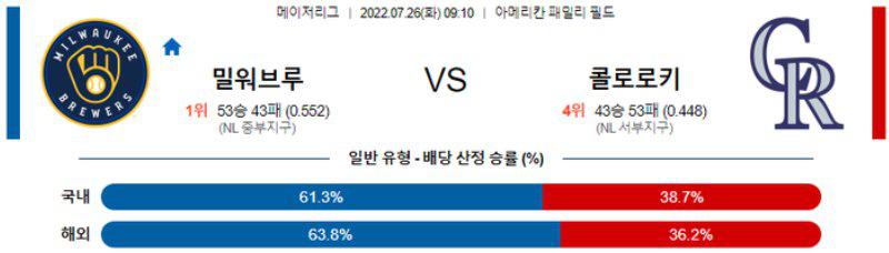 오버를 주력으로 삼는 것을 추천하는 매치. 애쉬비의 커맨드가 불안해 타자들을 많이 출루시킬 가능성이 높고, 프리랜드도 최근 홈런과 실점을 허용하는 빈도가 급격하게 늘어나고 있다. 지난 경기에서 타자들의 컨디션이 나빠보이지 않았기에 이번 경기에서도 타자들이 투수들을 공략하는데도 큰 무리가 없을 것이다. 좌투수 상대로 올 시즌 강한 모습(OPS 0.799)을 보여주고 있는 콜로라도의 승리를 점치는 것이 나아보이나, 오버만큼 확률이 높지는 않을 것이다.