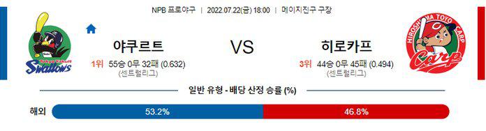 2연승 흐름 속에 주중 2승1패 성적을 기록한 야쿠르트와 1승1패 성적을 기록한 히로시마의 만남 이다. 야쿠르트는 산타나가 부상 복귀후 4경기에서 0.556의 고타율을 기록중이며 18일 요미우리와 경기에서는 멀티 홈런을 기록하는 절정의 타격감을 선보이고 있다. 또한, 이동 없이 연속 되는 홈경기 일정에 있다는 것도 도움이 될것이다. 야쿠르트 승리 가능성을 추천 한다.