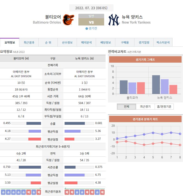 오늘 MLB 분석은 볼티모어 VS 뉴욕 양키스 분석 준비했습니다.
