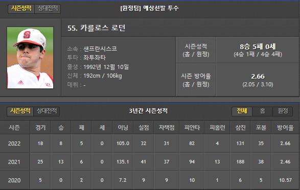 샌프란시스코는 이번 경기 카를로스 로던 선수가 선발로 등판합니다.
