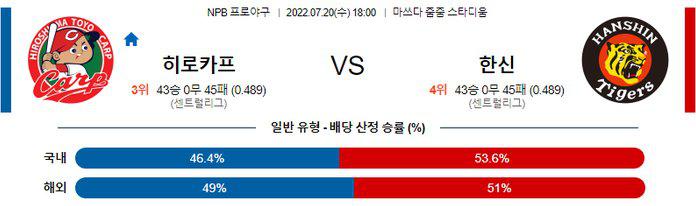 올시즌 상대전 2경기 1승, 13이닝 2실점(비자책)을 기록중인 드류 앤더슨 투수가 선발 싸움에서 밀리지 않는 경기다. 또한, 전일 경기에서 0-3, 패배를 기록했지만 선발 토코다 히로키 투수가 8이닝을 소화하면서 필승조 불펜의 소모를 막았다는 것이 수요일 경기에서 히로시마의 반격에 힘이 죄어줄 것이다. 히로시마 승리 가능성을 추천 한다.