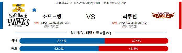 올시즌 상대전에서 1승을 기록했으며 소프트뱅크 상대로 통산 4승무패 2.08을 기록중인 타키나카 료타 투수가 표적 등판에 나서지만 2군에서 5경기 1승4패, 3.54의 만족할수 없는 기록 속에 1군에 콜업 된 타이밍 이라는 것에 베팅 포커스를 맞춰야 한다. 소프트뱅크 승리 가능성을 추천 한다.