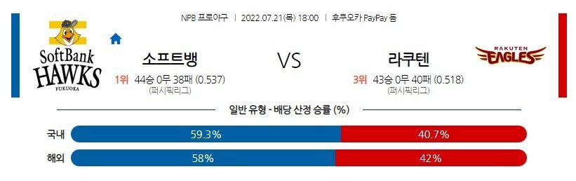 전일 경기 1-17, 패배로 2연패에 빠진 소프트뱅크가 에이스 카드를 꺼내는 경기다. 직전경기 등판에서 당시 5연패에 빠져 있던 팀을 구해낸 센가 고다이 투수의 독한(?) 투구를 다시금 기대해도 좋은 경기다. 소프트뱅크 승리 가능성을 추천 한다.