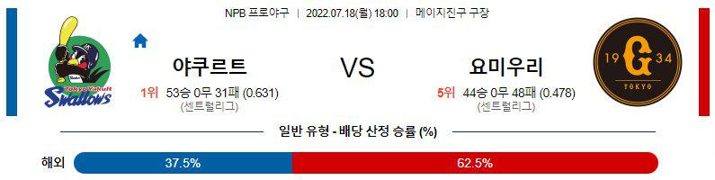 투수진 난조로 연패 탈출에 실패한 요미우리 자이언츠는 스가노 토모유키(6승 5패 3.08) 카드로 연패 저지에 나선다. 10일 DeNA와의 홈경기에서 7이닝 4실점의 부진한 투구를 보인 스가노는 최근 3경기에서 징검다리 호투가 이어지는 중이다. 특히 앞선 야무르트 원정에서 5이닝 7실점 패배를 당했는데 현재의 야쿠르트 타선을 고려한다면 이번 만큼은 설욕이 가능할 전망이다. 일요일 경기에서 홈런 2발 포함 5점을 올린 요미우리의 타선은 그야말로 홈런 외에 득점 수단이 너무나도 떨어지는게 최대의 고민이다. 그나마 워커의 가세가 도움은 되고 있는 편. 과부하가 극에 달한 불펜진은 정말 타이세이 외에 믿을 투수가 전멸했다고 해도 과언이 아니다.