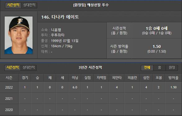 니혼햄은 이번 경기 다나카 에이토 선수가 선발로 등판합니다.