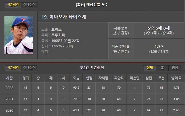 야마오카 선수는 이번 시즌 15경기 5승 5패 90.2이닝 70피안타 23실점으로