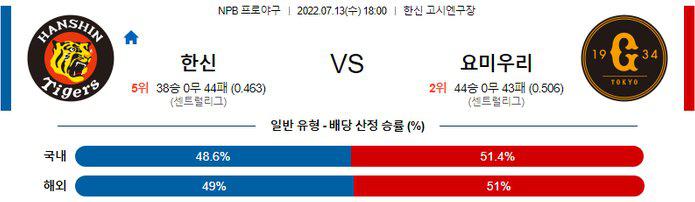 니시 유키 투수는 직전경기(7/6) 홈에서 히로시마 상대로 6.1이닝 2실점 승리를 기록했으며 이전경기(6/28) 원정에서 요코하마 상대로 5.2이닝 6실점 패배를 기록했다. 2연패에서 벗어나는 승리가 나왔으며 올시즌 14경기 5승6패, 11경기 QS+ 성적이며 최근 3경기 1승2패, 17이닝 13실점의 기록. 올시즌 14차례 등판중 3경기에서 위기를 넘지 못하며 패배를 기록했지만 나머지 11경기에서 짠물투수의 연속을 선보이며 통산 106승(92패)을 기록중인 관록의 투구를 선보였다. 올시즌 상대전 기록은 없다.