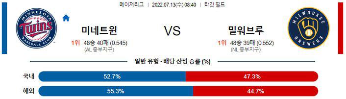 미네소타의 승리를 본다. 이 경기는 안정적인 로테이션 선발의 등판일이 아니기에 타선과 불펜의 힘에서 갈릴 것이다. 밀워키는 리그 최고의 클로저인 헤이더와 필승조가 이끄는 불펜이 막강하지만 최근 타선이 부진이 극심하다. 올스타 벅스턴과 아라에즈 외에도 해결할 선수가 즐비한 미네소타가 유리한 흐름으로 경기를 이끌 것이다.