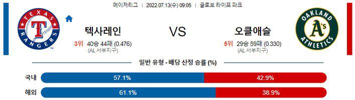텍사스의 승리를 본다. 첫 경기부터 타선의 폭발로 승리했는데 카프리엘리안 상대로 강한 타자들이 즐비하다. 오클랜드도 지난주부터 타선이 살아난건 분명하지만 홈팀에게 타선의 힘에서는 밀린다. 타선의 힘이 월등한 텍사스가 승리할 것이다.