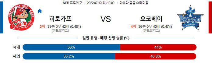 지난주 2승3패를 기록한 히로시마와 3승2무 성적을 기록한 요코하마의 만남 이다. 코로나 확진 이후 복귀한 이시다 켄타 투수의 투구 내용이 불안하다는 것을 체크해야 한다. 선발 싸움에서 우위에 있는 히로시마 승리 가능성을 추천 한다.