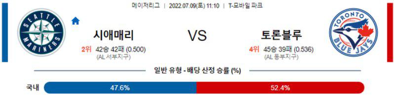 토론토의 승리를 본다. 커비가 신인왕에 도전하는 투수긴 하지만 리그에서 파워 툴이 가장 빼어난 토론토 중심타선 상대는 쉽지않아 보인다. 게레로와 비솃이 커비의 속구를 두들길 토론토 타선의 맹타를 기대할만 하다. 시애틀도 시리즈 1차전에 타선이 득점을 잘 뽑아냈지만 안정적인 베테랑의 경기 운영에 고전할 것이다.
