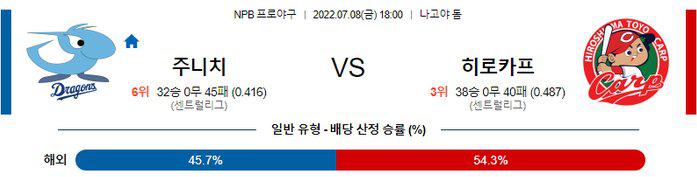 전일 요코하마 원정에서 12회 연장전 승부 끝에 0-0 무승부에 그치면서 4경기째 승리가 없는 주니치 보다는 한신 원정에서 9회 2득점을 뽑아내며 3-0 승리를 기록한 히로시마 타선에 대한 기대치가 높은 경기다. 또한, 선발 싸움에서도 상대전 꾸준한 모습을 보여준 오세라 다이치 투수가 우위에 있는 경기. 히로시마 승리 가능성을 추천 한다.