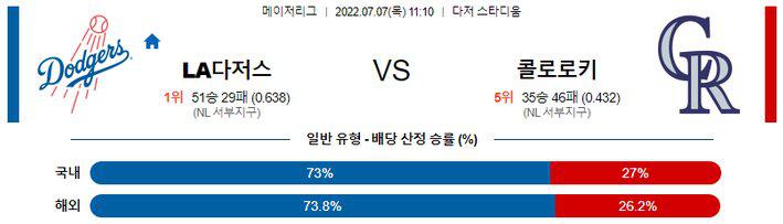 다저스의 승리를 본다. 오랫만에 빅리그로 돌아온 우레나와 달리 화이트는 선발로 충분히 경쟁력을 보이고 있다. 먼시가 살아나며 팀 타선에 힘이 붙은 다저스인데 우레나와 콜로라도 불펜을 경기 내내 두들길 수 있을 것이다.