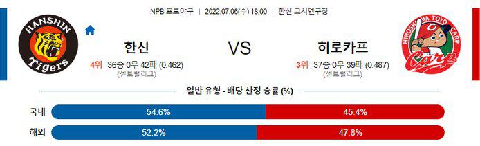 지난주 4연패를 끊은 이후 2연승을 만들어 낸 한신과 2승4패 성적을 기록한 히로시마의 만남 이다. 화요일 경기가 취소 된 가운데 두 팀 주소모두 화요일 경기 선발 예정이였던 선발 투수의 변경 없이 수요일 경기를 치르게 되는 상황. 올시즌 상대전에서 강점을 보여준 토코다 히로키 투수 였지만 우천 취소후 다음날 등판에서 피안타 허용률이 올라갔던 토코다 히로키 투수 였다는 것을 기억해야 한다. 한신 승리 가능성을 추천 한다.