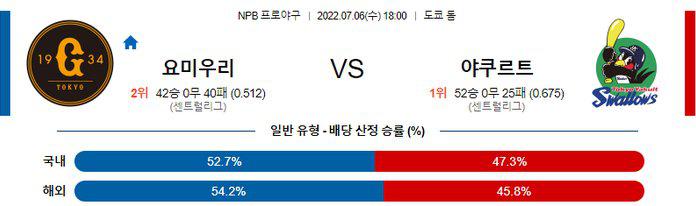 올시즌 요미우리는 메르세데스 투수가 선발로 나온 11경기에서 9승2패의 높은 승률을 기록하고 있다. 또한, 전일 경기에서 1-4 패배를 당하는 과정에서 야쿠르트는 투타 주소모두가 부진했다. 요미우리 승리 가능성을 추천 한다.