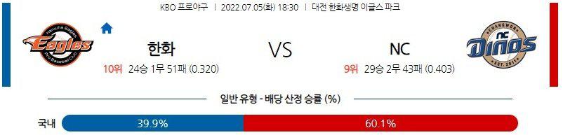 지난주 1승4패 성적 속에 4연패에 빠져 있는 한화와 2연승 흐름 속에 2승1패를 기록한 NC의 만남 이다. 한화의 불안한 수비와 투타의 엇박자 현상에 우선적으로 베팅 포커스를 맞춰야 하는 경기. 또한, 에이스의 부활을 신고한 구창모 투수가 선발 싸움에서 우위에 있는 경기다. NC 승리 가능성을 추천 한다.