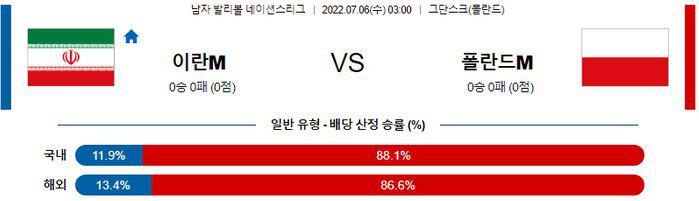 폴란드 홈에서 펼쳐지는 경기다. 도쿄 올림픽 까지 팀의 에이스가 되었던 사에드 마루프나 세예드 무사바 세터의 자리를 이번대회에 대신하고 있는 모하마드 타허 세터의 경기력에 따라서 팀 경기력과 성적이 요동을 치고 있는 이란 이다. 또한, '도 아니면 모'가 되는 강한 서브를 구사하는데 있어서 당일 서브 컨디션도 경기별로 차이가 너무 큰 상황. 폴란드가 승리를 놓치지 않겠지만 이란의 서브가 1개 세트 이상은 효과적으로 폴란드 코트를 향해서 날아올수 있을 것이다.