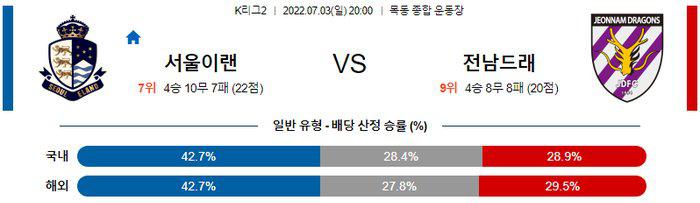 양 팀 주소모두 승리가 없기 때문에 적극적인 공세로 나올 것으로 판단되기 때문에 다득점 페이스로 흘러갈 가능성이 높겠다. 전남이 최근 5경기 중 3경기에서 오버(2.5 기준)가 나온 점도 참고하면 좋다. 또한 전남은 감독 교체 후 승리가 없지만, 패배도 없다. 점점 경기력이 나아지는 추세. 반면 서울이랜드는 성적에 이어 경기력조차 좋지 못한 모습으로 흐름은 점점 더 악화되고 있다. 이장관 감독이 이번 일정에서 전남 부임 후 첫 승리를 따낼 것으로 예상된다.