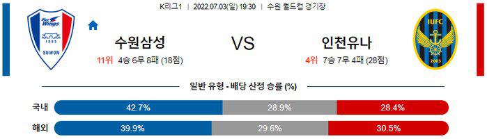 인천은 무고사가 빠져 공격력이 매우 줄었다는 점, 수원삼성이 최근 4경기에서 1골밖에 넣지 못하고 있다는 점을 고려하면 언더(2.5 기준)의 확률이 높겠다. 또한 수원삼성은 공, 수 주소모두 문제를 겪으며 4연패의 부진에 빠져있다. 그러나 이번 시즌 홈에서는 나름대로 좋은 경기력을 보여주고 있으며, 인천도 ‘주포’ 무고사가 빠졌기 때문에 마냥 쉽게 무너지지는 않을 전망. 직전 경기에서 주장과 선수단이 서포터들에게 좋은 모습을 보여주겠다고 다짐하는 등 절치부심하는 모습을 보여주기도 했다. 온전한 승점 3점은 무리겠지만 승점 1점 정도의 가능성은 있겠다.