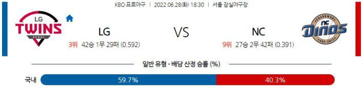 지난주 4승1패를 기록하는 가운데 2연승의 흐름에 있는 LG와 1승4패 성적 속에 3연패에 빠져있는 NC의 만남 이다. LG 선발진의 중심이 되는 케릴 투수와 1년여 만에 복귀한 이후 4연승을 기록하며 에이스의 부활을 신고한 구창모 투수의 팽팽한 투수전이 예상되는 경기다. 많은 득점이 나오지는 않을 것으로 예상되며 LG가 뒷심 대결에서 우위를 보여줄 것이다. LG 승리 가능성을 추천 한다.